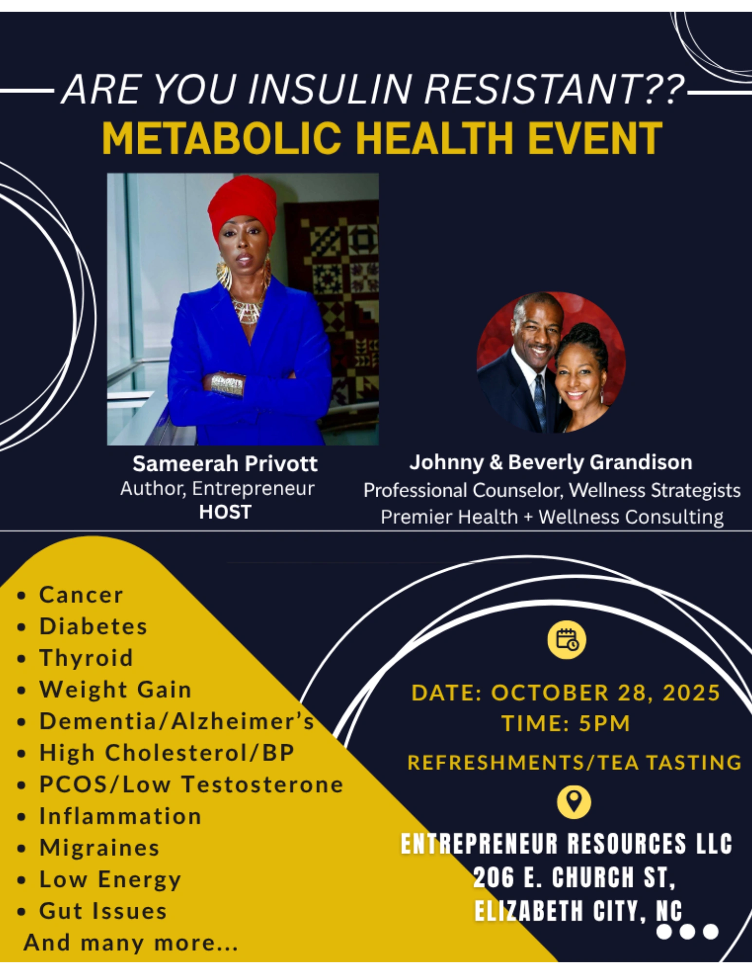 Are you insulin resistant? Join us for our upcoming Metabolic Health Event on October 28, 2025, 5:00 pm, featuring Sameerah Lynn - Author, Entrepreneur, and Wellness Strategist. She and her colleagues will discuss various issues associated with insulin resistance and provide methods for dealing with/mitigating them.